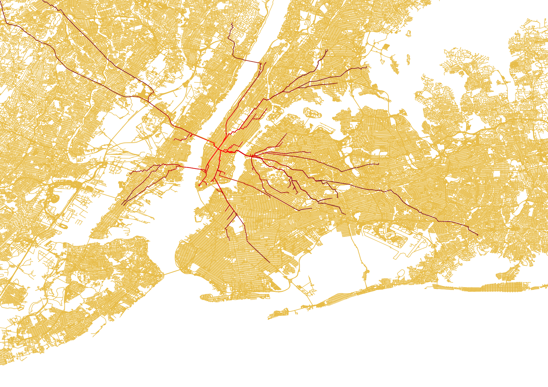 The map above shows travel distances from Penn Station to 194 NYC pizza places. Made using PostGIS, pgRouting, QGIS, python, and with OpenStreetMap data.