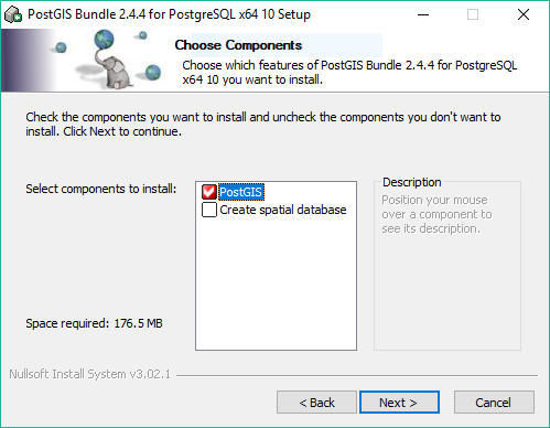 Install PostgreSQL (I used v10.5) from EnterpriseDB. Uncheck stackbuilder, we will not use pgAdmin (a graphical interface for PostgreSQL) either though you may want to use it later.